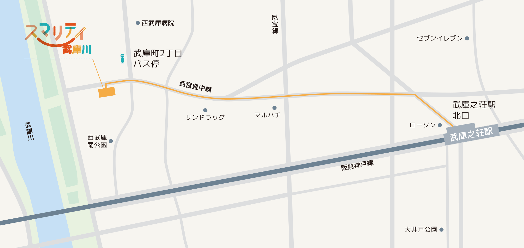 | 交通 | 阪急神戸本線武庫之荘駅北口 ・徒歩17分 ・阪神バス 阪急武庫之荘[北]〜武庫町2丁目(所要時間10分) バス停より徒歩5分 |